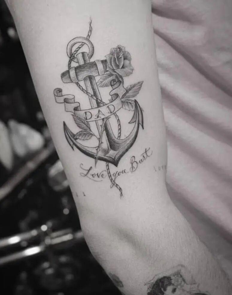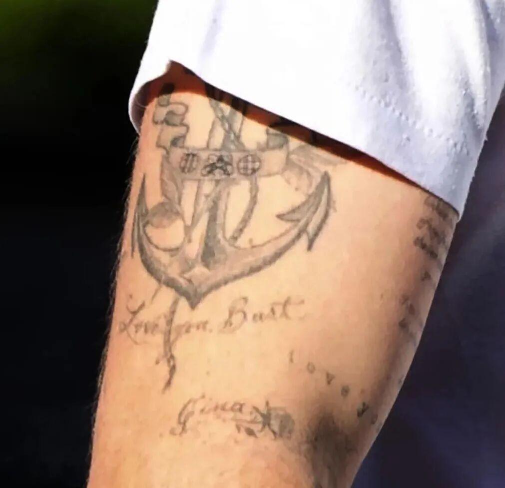 大布胳膊上有一个船锚文身,上面写着“DAD”,老爸。
