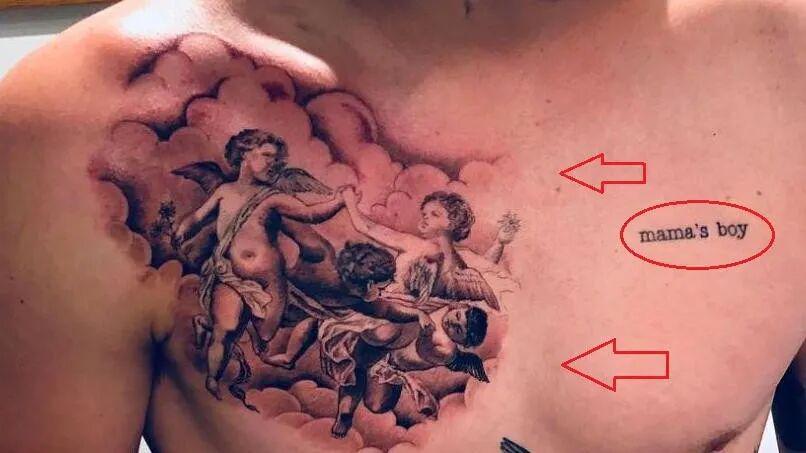 左胸口上现在图案繁复,原本的“mama's boy”也基本看不清了,必须放大看才能看到。