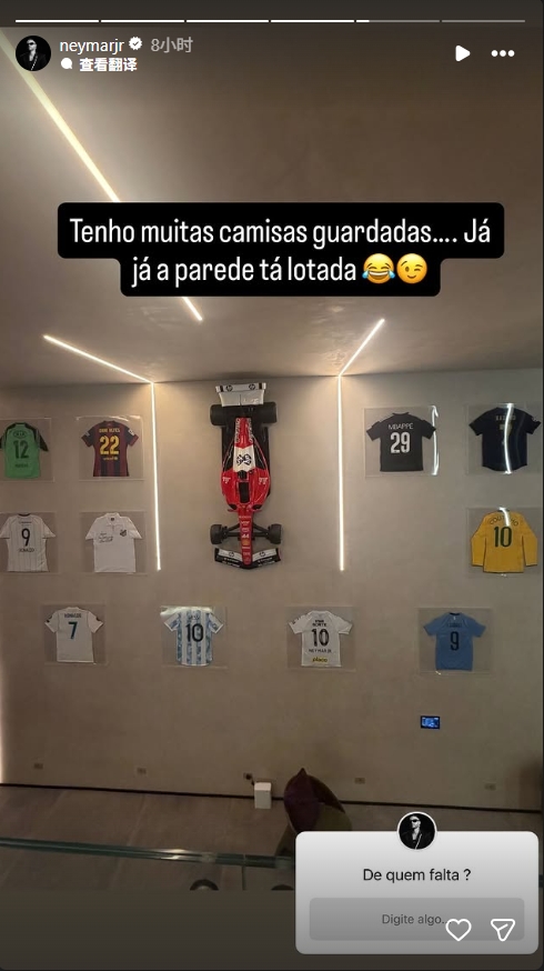 内马尔配文:“我囤了很多球衣……很快就能挂满一墙😂😉缺了谁的?”